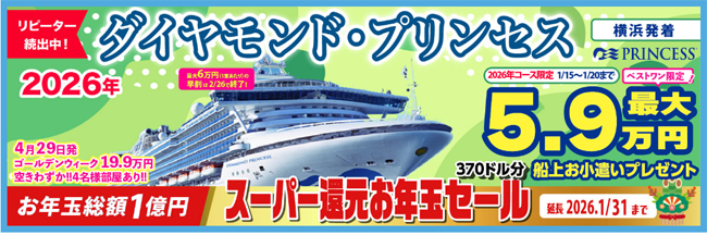日本発着のショートクルーズ(3〜5泊)から世界一周まで、新着もどんどん増えていて、特にGWのコスタ・セレーナチャーターや、ダイヤモンド・プリンセスの船上クレジット増量キャンペーン(125ドル/部屋)が目立ってました。